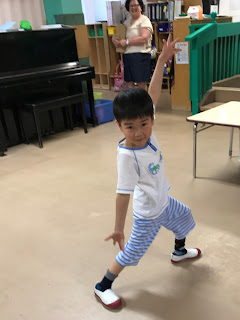 まずは朝の体操から。足を大きく拡げてーイチニ!